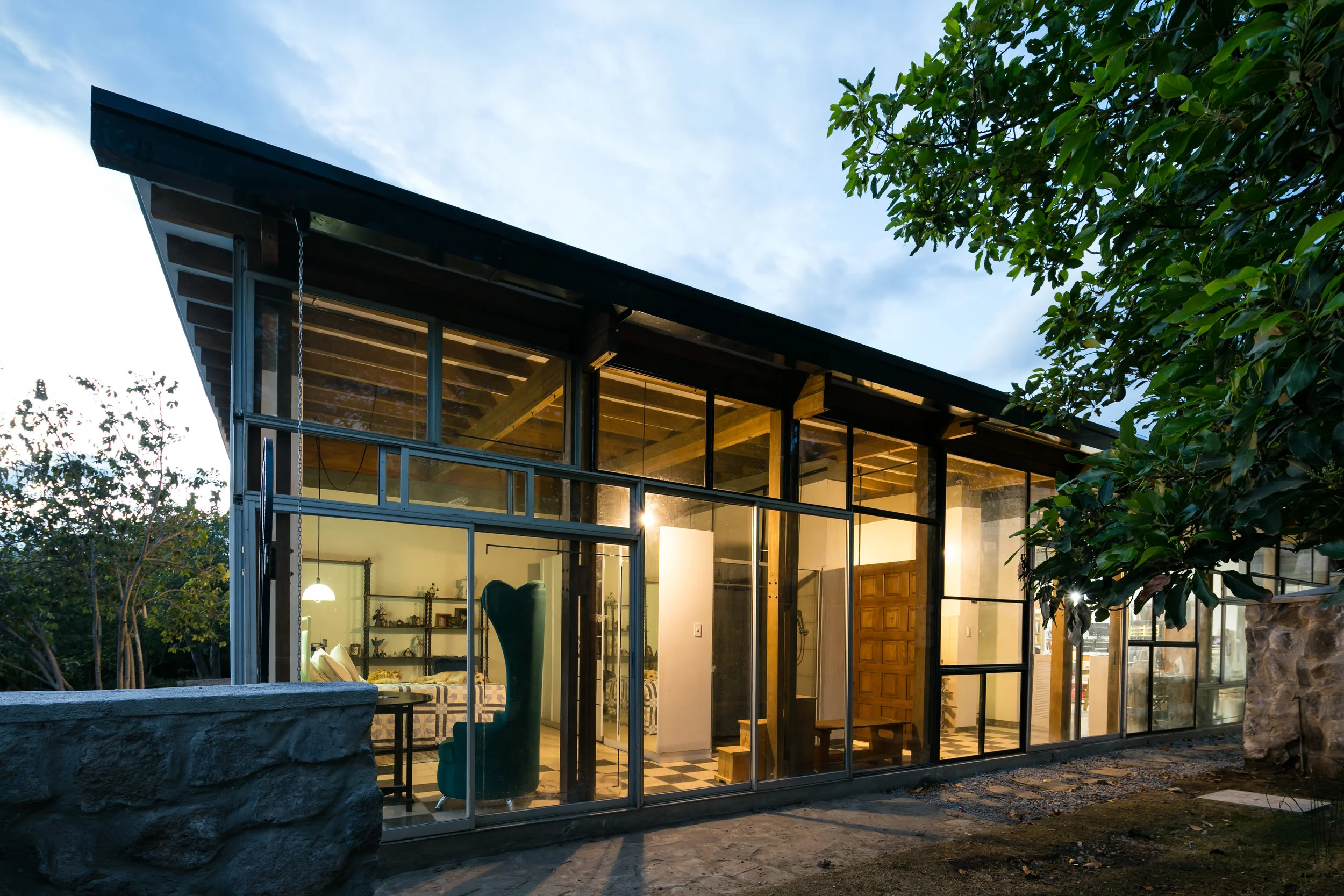 En primer lugar, la búsqueda de un solo nivel conlleva a un desalojo de tierra considerable. La tierra amontonada entonces, se convierte en la estructura y mampostería del proyecto. Por otra parte, casi la totalidad de la ventanería y mobiliario interior se recicla de la casa antigua de la propietaria. Todo se reusa en el nuevo proyecto a manera de parche: varios elementos -que aparentemente no pueden acoplarse a la propuesta o no tienen más vida útil- se unen a través de diferentes sistemas. Las ventanas se juntan entre si y se adaptan a las columnas de madera y paredes de tierra, puertas restauradas cuelgan de soleras de hormigón, muebles repintados y rehabilitados cambian y se adaptan a nuevos espacios y algunas rejas viejas forman parte del nuevo jardín exterior.