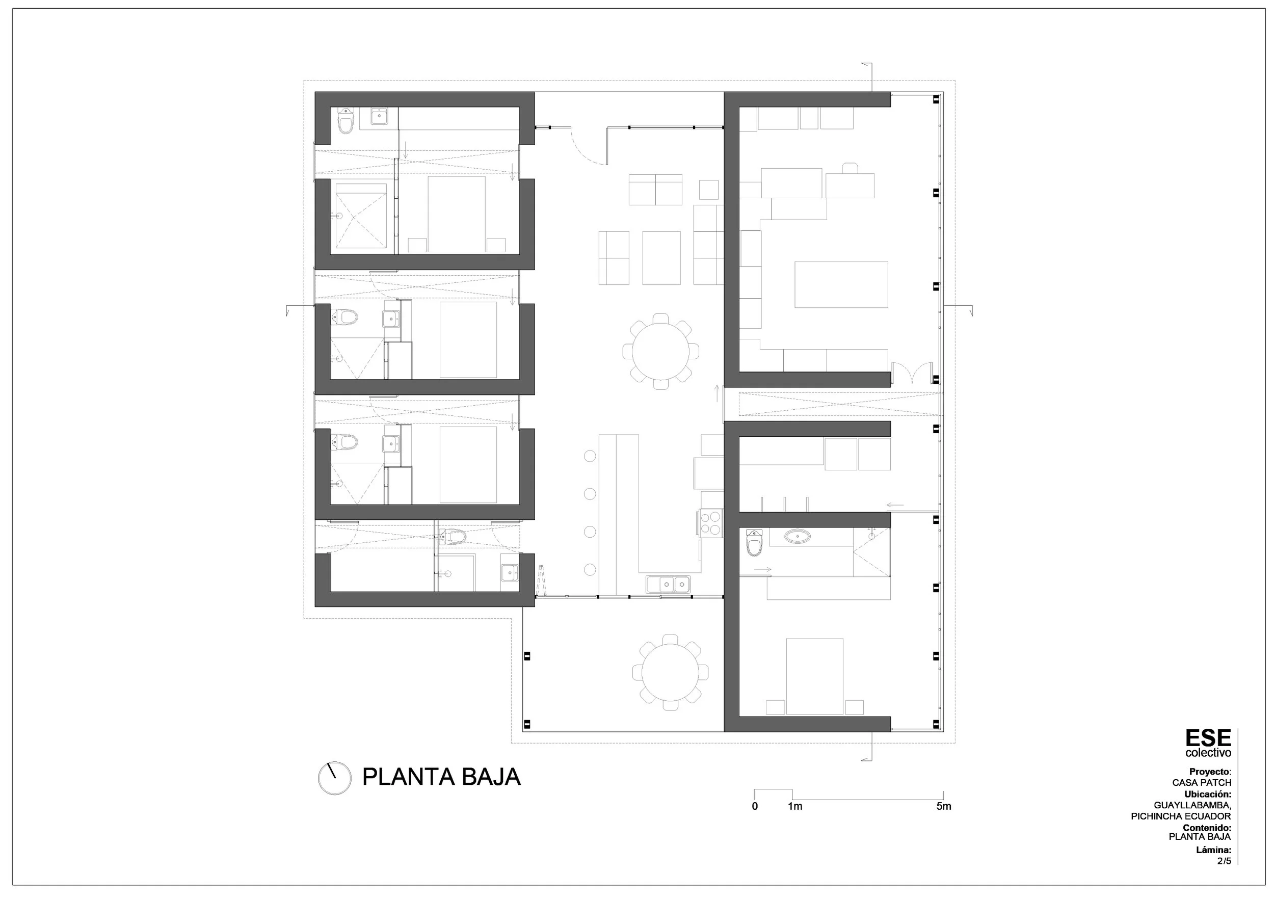Muros de tapial de tres metros de alto se levantan formando una C por rigidez estructural, elemental en la construcción con tierra. Los muros en C abrigan los espacios privados de la casa, cerrándose con las ventanas y puertas reutilizadas de la casa antigua. Por un lado, el taller, el dormitorio y un cuarto para mascotas, espacios que le permiten retraerse aún cuando la casa está llena. Son espacios que se abren a un jardín privado mediante una mampara hecha como un collage de ventanas recicladas. Por otro lado, los cuartos de los hijos o de algún huésped ocasional, concebidos como espacios mínimos de descanso.