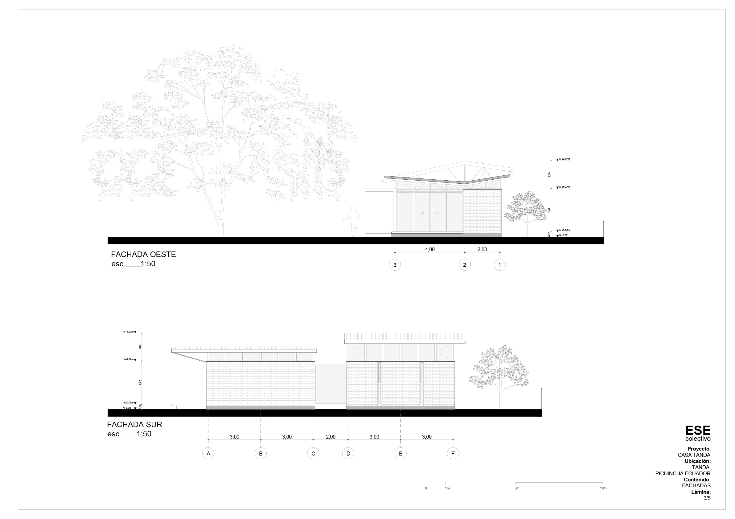 En el interior, paneles de yeso y polialuminio resuelven las escasas divisiones, mientras que, al exterior, la fachada principal se recubre con mamparas de vidrio altas. Finalmente, un deck de madera bordea la fachada como espacio intermedio entre la casa y el exterior. Los aleros de la cubierta se extienden para proteger el deck del clima y permiten formar un pequeño espacio de contemplación de la naturaleza, el árbol y el paisaje.
