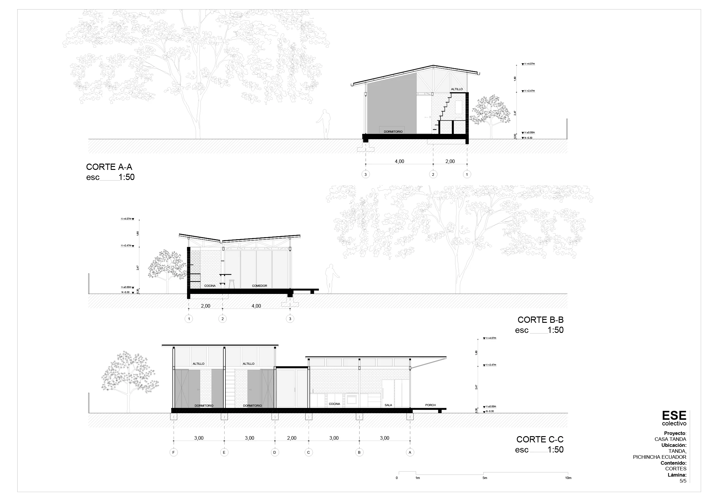 El proyecto se sostiene en dos sistemas estructurales. El primero, es una estructura metálica ligera, diseñado para reutilizar todas las cerchas de las carpas disponibles. Para la barra trasera, se opta por muros autoportantes de ladrillo, de modo que estructura y cerramiento se fusionan en un solo elemento constructivo. Siguiendo la lógica estructural del proyecto, resultó pertinente utilizar el espacio sobre los baños como un altillo de baja altura como espacio los niños de la familia. Este espacio modificó el diseño en sección de la casa, incorporando una cubierta con pendiente positiva para el área privada y otra cubierta con pendiente negativa para el área social. El remate de ambas cubiertas se resuelve a través del área de ingreso, espacio sobre el cual se proyecta una terraza accesible que permite aprovechar la vista del paisaje desde el exterior.