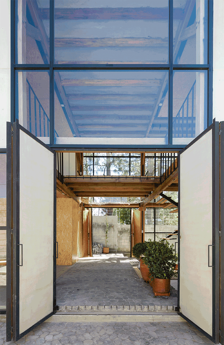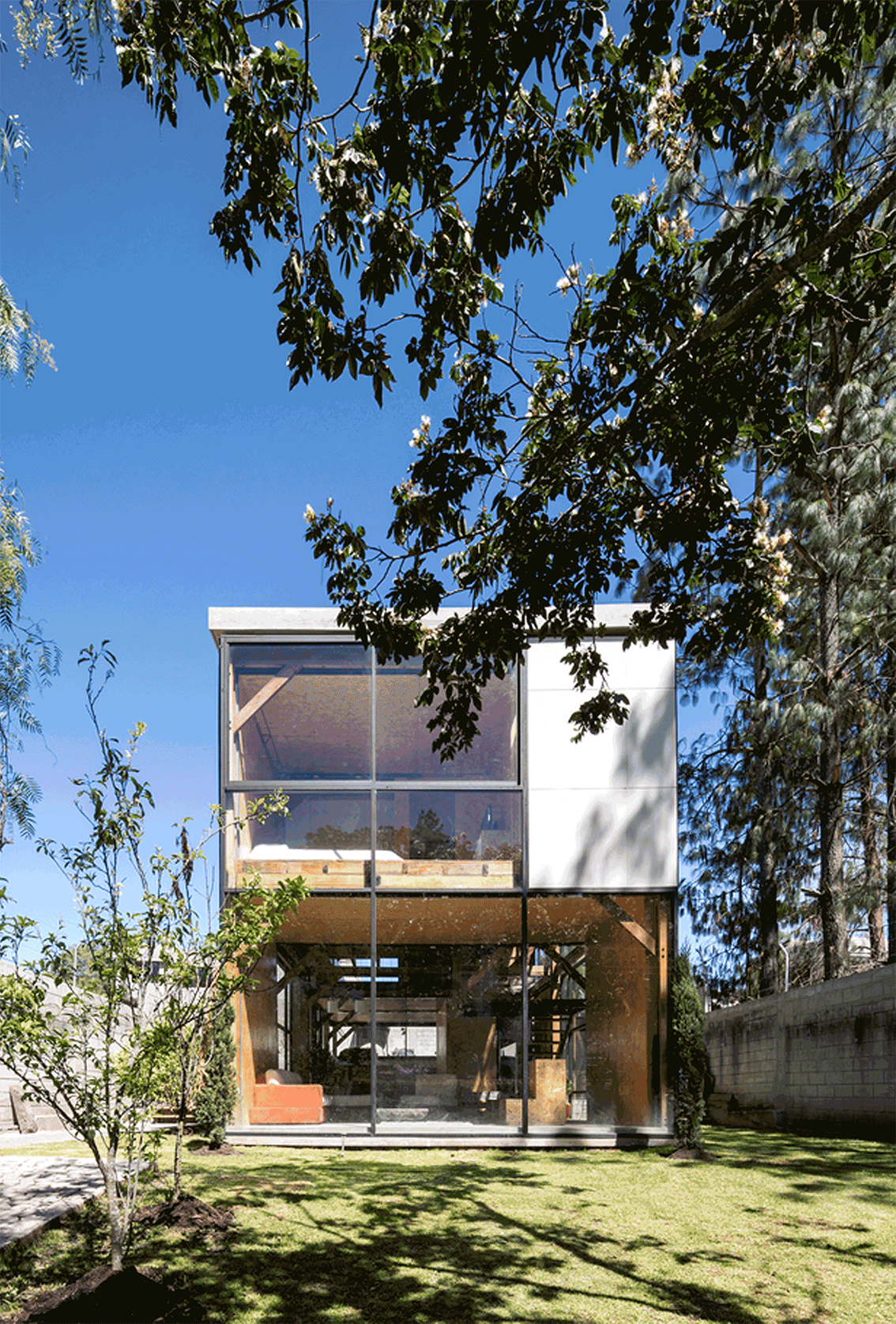 La propuesta es una barra alargada de dos plantas que ocupa una mínima cantidad de terreno; una casa rodeada de verde. Se respetan retiros laterales y se dejan dos jardines: posterior privado y frontal. En medio de la barra, un paso a manera de jardín interior, junta los dos retiros laterales a través de dos puertas plegables amplias. Una vez abiertas, las puertas funcionan como un doble acceso a la casa y conjugan la circulación entre el gran jardín circundante y las áreas interiores.