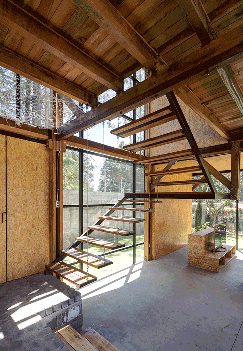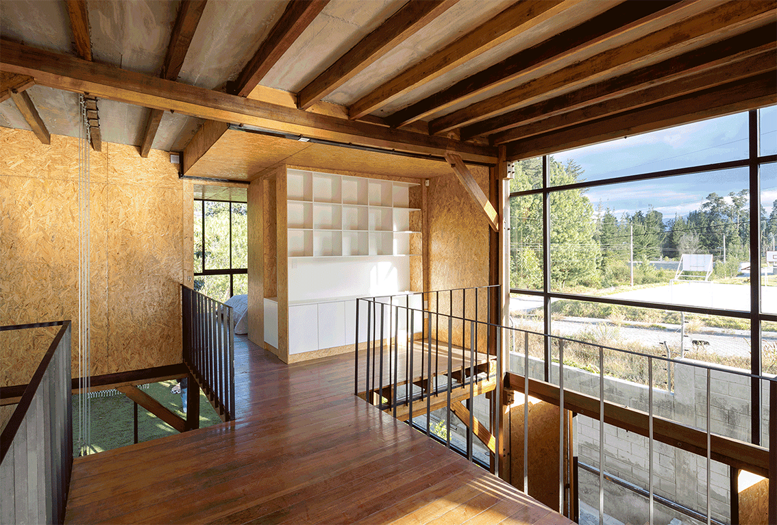 Finalmente, las paredes internas y externas se construyen en seco con paneles de varios tipos. La modulación se basa en las medidas estándar de las planchas y se distribuyen buscando el menor desperdicio. En el exterior, planchas machihembradas de fibrocemento hidrofugado, se juntan a manera de cascarón para proteger la estructura de madera. En el interior se usan paneles de OSB y fibrocemento regular.